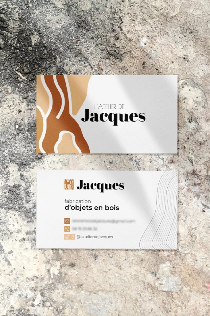 Des cartes de visite qui reprennent les codes de l’identité visuelle de Jacques : des déclinaisons de beiges & marrons et des formes arrondies !