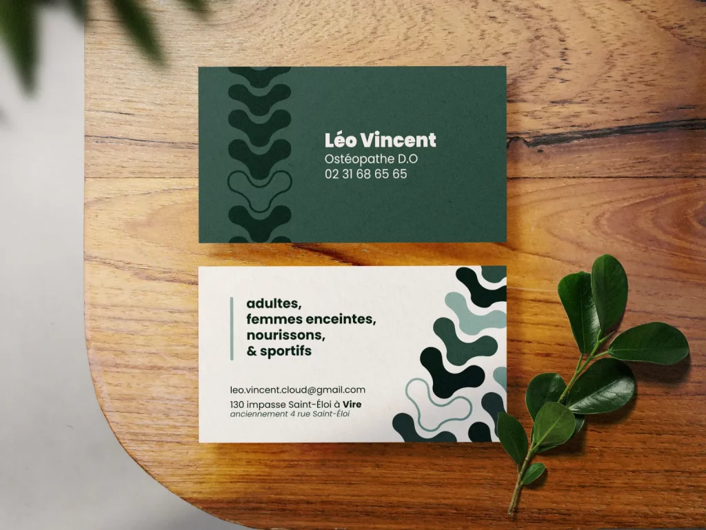 Des cartes de visite sobres au recto, et plus travaillées au verso, qui permettent aux patients de Léo de trouver ses coordonnées.